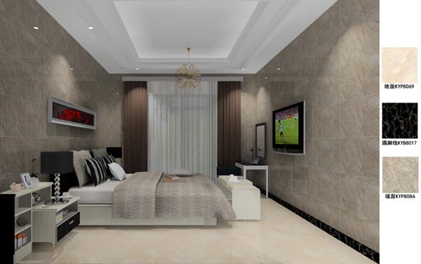 該臥室的風格是現代時尚,線條簡明的臥室家具盡顯利落與大方,牆麵跟地麵選用了米色的金剛釉KYP8069跟灰色紋理的金黃天龍KYS8086相搭配,顯得更加時尚與大氣。