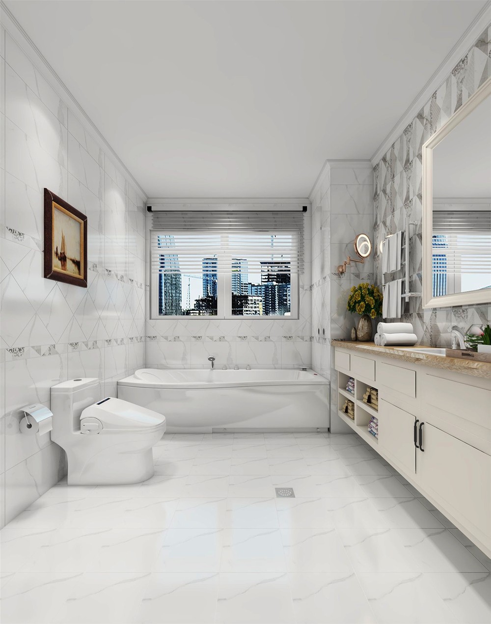 整體空間采用白色大理石紋理噴墨瓷片,布局寬敞明亮,幾何圖形的瓷片牆麵,讓沐浴區與洗手台有了巧妙的區分。米黃色大理石紋理的洗手台耐髒,洗手台下是多功能的儲物櫃,有拉式櫃桶也有開放式櫃桶,考慮得十分周到。