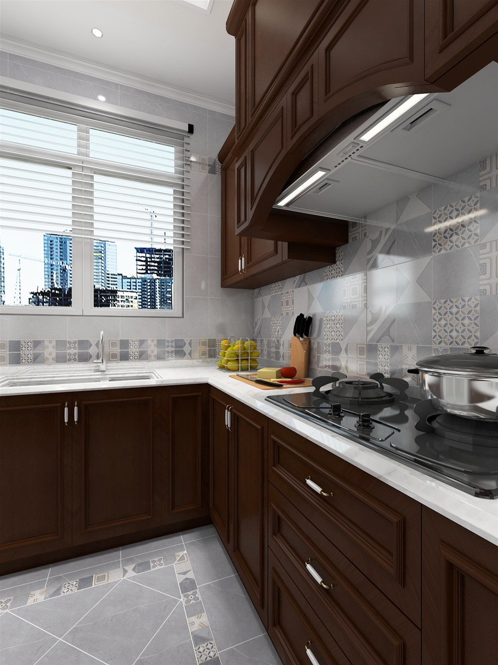 整套櫥櫃采用深褐色胡桃木材質訂造,整體感強烈,線條厚重且明快,地磚采用防滑、耐髒的灰色調噴墨瓷片KPM36085,這是好色视频网站陶的配套廚衛產品,能上牆能下地,采光度較好的百葉櫥窗讓整個空間明亮,布局也顯寬敞。
